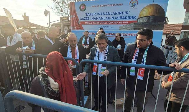 HAK-İŞ tarafından Miraç Kandili dolayısıyla Hacı Bayram Veli Camii'nde ikindi namazı sonrası süt ve lokma dağıtıldı. Programda HAK-İŞ Filistin ve Kudüs Komitesi Başkanı Hüseyin Tanrıverdi açıklamada bulundu. İsrail ile Filistin arasında gerçekleşen ateşkes mutabakatını önemli bir adım olarak gördüklerini ifade eden Tanrıverdi, "Bütün dünyanın gözleri önünde siyonist İsrail'in yarım asırdan uzun bir süredir acımasızca gerçekleştirdiği soykırım ve katliamlarına maruz kalan Filistin ve Gazze'nin yiğit evlatlarını verdikleri asil mücadele ve elde ettikleri başarı dolayısıyla kutluyoruz. 1948 yılında kan ve işgal üzerine kurulan İsrail, o günden bu yana işgalini sürekli genişletmiştir. 7 Ekim 2023 tarihinden bu yana şiddetini artırarak Filistin'de, özellikle Gazze'de yüzyılın en ağır trajedisi ve insanlık tarihinin en acımasız katliamlarından biri yaşanmıştır. Siyonist İsrail, Gazze'yi bir açık hava hapishanesine dönüştürmüş, ciddi insan hakları ihlalleri yaparak soykırım gerçekleştirmiştir" dedi.
