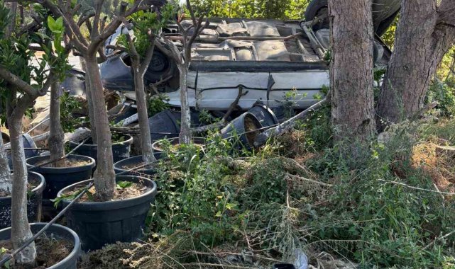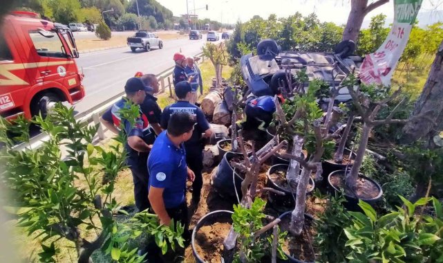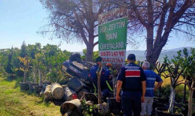 Aydın'ın Buharkent ilçesinde direksiyon hakimiyeti kaybolan ve yol kenarındaki fidanlığa uçarak ters dönen aracın sürücüsü itfaiye ekiplerinin çalışması sonucunda yaralı olarak kurtarıldı.