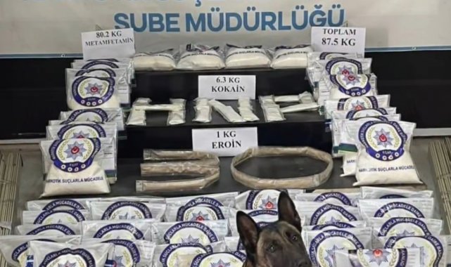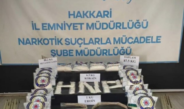 Hakkari İl Emniyet Müdürlüğü'ne bağlı Narkotik Suçlarla Mücadele Şube Müdürlüğü görevlilerince uyuşturucu madde imal ve ticaretini önlemek amacıyla çalışmalar aralıksız devam ediyor. Yapılan çalışmalarda; Yüksekova ilçesinde Narkotik köpeği ile bir kamyonette yapılan aramada zula diye tabir edilen bölgelerde 80 kilo 200 gram metamfetamin maddesi, 6 kilo 300 gram kokain maddesi ile 1 kilo eroin maddesi olmak üzere toplam 87 kilo 500 gram uyuşturucu madde ele geçirildi. Olayla ilgili gözaltına alınan 2 şüpheli hakkında adli işlemler başlatıldı.