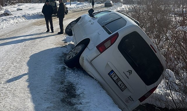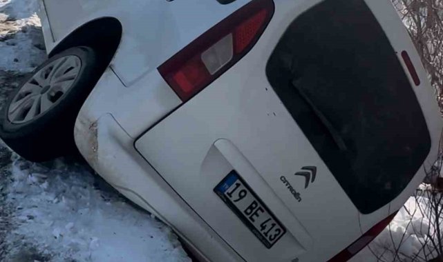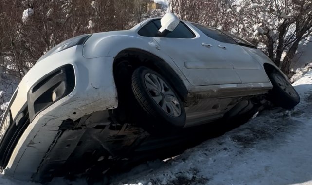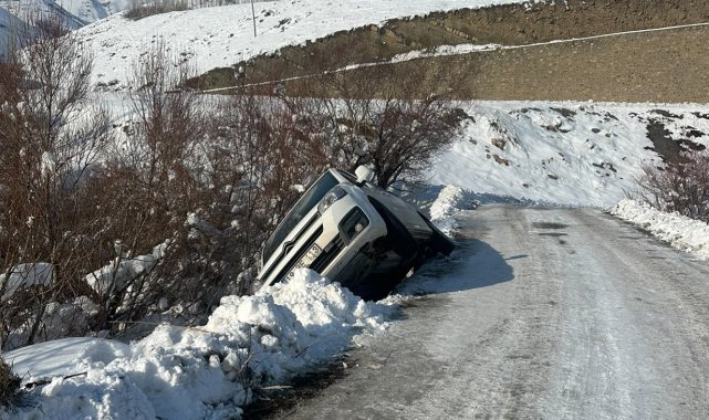 Hakkari'de virajı alamayarak yoldan çıkan araç köprü kenarında asılı kaldı