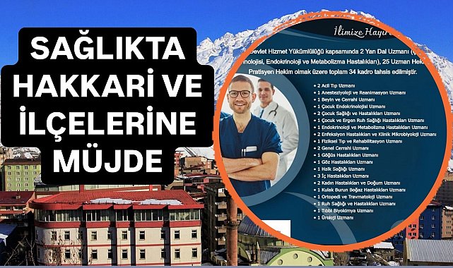 Hakkari Valiliğinden yapılan açıklamada, "122. Devlet Hizmet Yükümlülüğü kapsamında ilimize 2 yan dal uzmanı (Çocuk Endokrinolojisi, Endokrinoloji ve Metabolizma Hastalıkları), 25 uzman hekim ve 7 pratisyen hekim olmak üzere toplam 34 kadro tahsis edilmiştir. Yapılan bu kadro tahsislerinin Hakkari ilimize hayırlar getirmesini temenni ederek, Sayın Cumhurbaşkanımız Recep Tayyip Erdoğan ve Sağlık Bakanımız Sayın Prof. Dr. Kemal Memişoğlu'na şükranlarımızı arz ederiz" ifadelerine yer verildi.