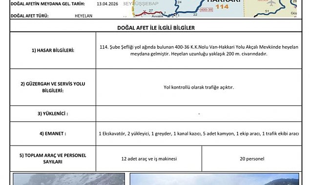 Hakkari Valiliğinden yapılan açıklamada, 13 Nisan 2026 tarihinde Hakkari-Van kara yolunun Akçalı mevkiinde heyelan meydana geldiği belirtildi. 114. Şube Şefliği yol ağı içerisinde bulunan 400-36 K.K. numaralı güzergahta oluşan heyelanın yaklaşık 200 metre uzunluğundaki bir alanda etkili olduğu bildirilen açıklamada, heyelanın ardından ilgili kurum ve ekiplerin hızla bölgeye sevk edildiği, yol güvenliği ve ulaşımın devamlılığının sağlanması amacıyla gerekli tedbirlerin alındığı ifade edildi.