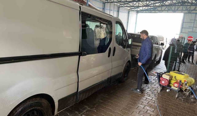 Irak'ta hayvanlarda çıkan şap hastalığı üzerine Çukurca Tarım ve Orman Müdürlüğü ekipleri de Üzümlü Sınır Kapısı'nda dezenfektan istasyonunu kurarak giriş yapan araçları tek tek dezenfekte ediyor