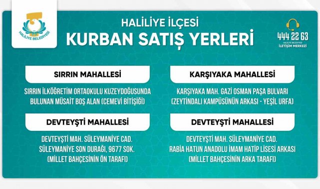 Haliliye Belediyesi, Kurban Bayramı öncesinde vatandaşların kurban alacağı satış yerlerini ve kesim yapacağı noktaları duyurdu.