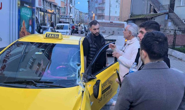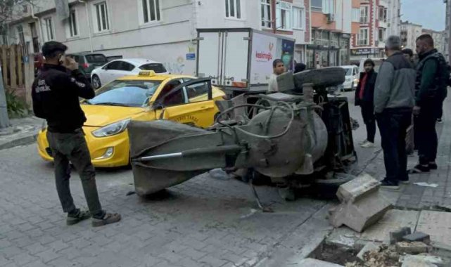 Tekirdağ'ın Çorlu ilçesinde ticari taksinin yol verdiği panelvan minibüsün arkasında takılı harç karma makinesi, taksinin üzerine devrildi. Taksi şoförü kazayı hafif sıyrıklarla atlattı.