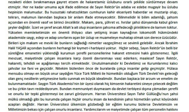 "Yükselen memleketimizin en önemli ihtiyacı olan yetişmiş insan kaynağının lokomotifi hükmündeki akademide saygı, edep ve adap sınırlarını aşan bir üslup ve muameleye muhatap olmak son derece üzücüdür" diyen Yaşar, "Birileri için makam ve mevki ile bunların sağladığı nimetler vazgeçilmez ve sevimli gelebilir. Ancak İbrahim Halil Yaşar açısından bunların herhangi bir kıymet-i harbiyesi yoktur. Hiçbir sebep, sayın rektörün belli bir süreliğine emanetini yüklendiği kurumun şerefli personellerine hakaret etmesini haklı gösteremez. İlgili mevzuat, maiyetinde çalışan insanlara karşı özenli davranmayı vaaz ederken, maalesef sayın rektör, hakareti, tehdidi ve aşağılamayı tercih etmektedir. Unutulmamalıdır ki devletimiz ve kurumlarımız kalıcı, şahıslar ise fani ve geçicidir. Nitekim bizlerden önce de buralarda çokça insanlar gelip geçmiştir. Hülasa mensubu olmayı en büyük onur saydığım Yüce Türk Milleti ile hizmetkarı olduğum Türk Devleti'nin geleceği olan genç nesillerin yetişmesine katkı sunmak en büyük idealimdir. Bundan başkaca bir arzum ve emelim de bulunmamaktadır. Saygın Türk akademisinin bir üyesi olarak hiç kimsenin hakaretini sineye çekecek değilim ve bu çirkin tavrı reddediyorum. Bundan memnuniyet duymasam da devlet terbiyesi dışına çıkmadan şerefli ve onurlu bir tepki göstermeyi ise zaruri görüyorum. Harran Üniversitesi Sayın Tahir Güllüoğlu'nun şahsi mülkü olmadığı gibi bu kurumda çalışan hiçbir onurlu insan da kendisinin şahsi hizmetkarı yahut köyündeki azapları değildir. Harran Üniversitesi ülkemizin gözbebeği bir eğitim kurumu bizlerse devletimizin ve milletimizin bekası için çalışan onurlu insanlarız. Yardımcılarım ve maiyetimde çalışan tüm personelin hakkını ve hukukunu savunmak benim için bir namus meselesidir. Meselenin kişiselleştirilmesi durumunda Cumhurbaşkanlığı başta olmak üzere gerekli kurumlar nezdinde girişimlerde bulunacağımı da açıkça beyan ediyorum. Hatırlatmak isterim ki adalet incinirse her şey incinir. Allah'tan gayrı çekinecek ve korkacak kimse de yoktur. Allah'ın takdirinden öte bir kuvvet ve kudret de yoktur. O, dilemedikçe bir şey olmaz, O dilerse de kimse mani olamaz. Böyle inandık böyle iman ettik" ifadelerine yer verdi.