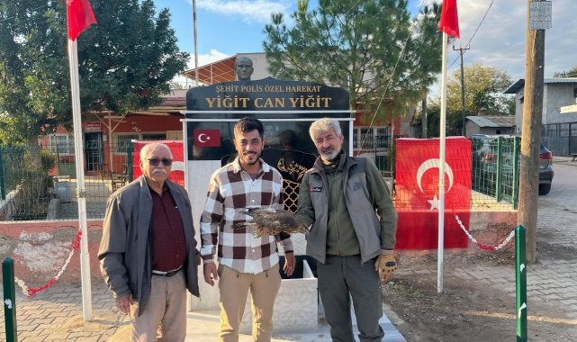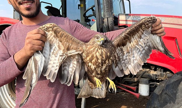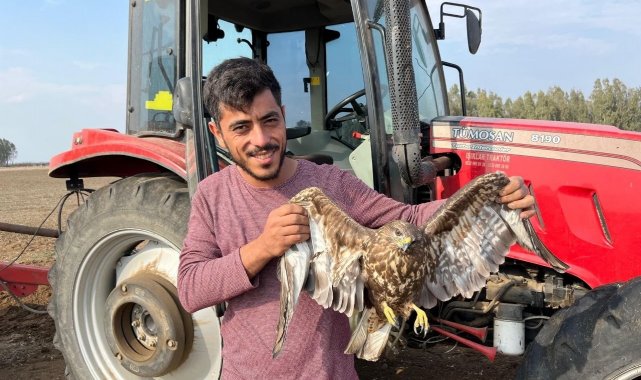 Adana'nın Ceyhan ilçesinde yer fıstığı hasadı yapan bir çiftçi, tarlada uçamayan bir şahin görünce hasadı bırakıp onun yardımına koştu.
