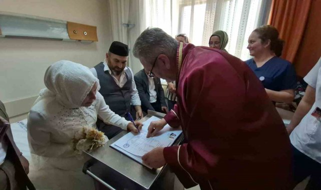 Düzce(İHA) – Düzce'de bel fıtığı şikayeti ile hastaneye yatan ve bir dizi operasyon geçiren Osman Dilek, Filiz Çetin ile özel gün olarak seçtikleri tarih operasyon sonrasına gelince nikahlarını Düzce Üniversitesi Hastanesinde kıydılar. Mahalle muhtarının kıydığı nikahtan sonra gelin ve damat hastane odalarını gezip diğer hastalara hem nikah şekeri verdiler hem de şifa dilediler.