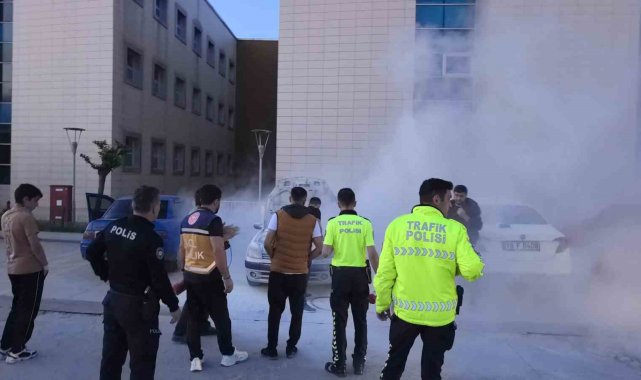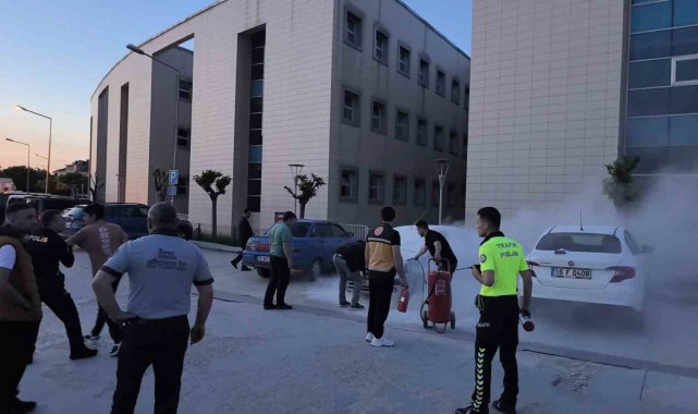Hastane otoparkında park halindeki araç alevlere teslim oldu