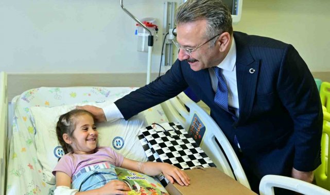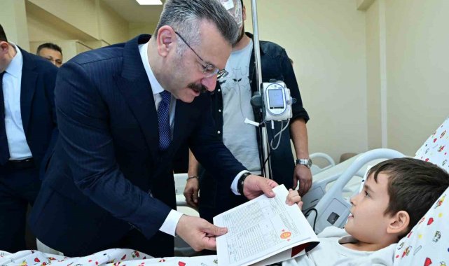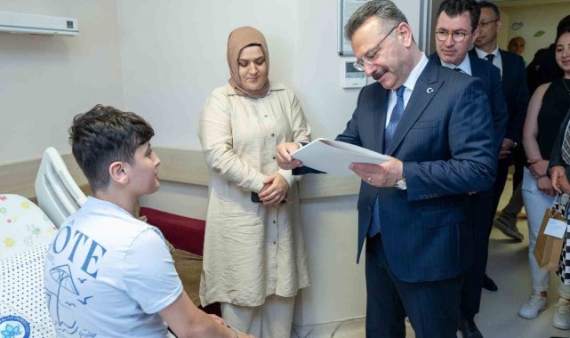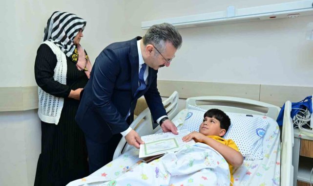 Hastanede tedavi gören öğrencilere karnelerini Vali Aksoy dağıttı