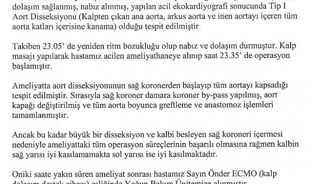 12 saate yakın süren ameliyat sonrası hastamız Önder ECMO (kalp dolaşım destek cihazı) eşliğinde Yoğun Bakım Ünitemize alınmıştır. Hayati tehlikesi halen devam etmektedir" ifadelerine yer verildi.