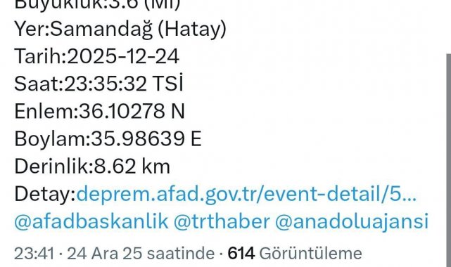 AFAD'dan alınan bilgiye göre, saat 23.35'te merkez üssü Hatay'ın Samandağ ilçesi olan 3,6 büyüklüğünde bir deprem kaydedildi. Sarsıntı yerin 8,6 kilometre derinliğinde meydana geldi. Depremin etkisiyle tedirginlik yaşayan vatandaşlar soluğu sokakta aldı. İlk belirlemelere göre deprem nedeniyle kentte herhangi bir olumsuzluk yaşanmadı.