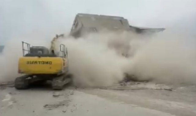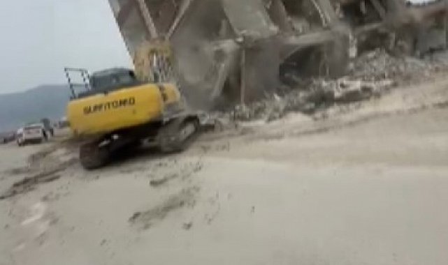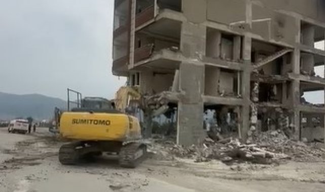 Kahramanmaraş merkezli depremlerde ağır hasar alan Hatay'da mahkeme süreci sona eren binaların yıkım ve enkaz kaldırma çalışmaları aralıksız sürüyor. Defne ilçesi Çekmece Mahallesi'nde bulunan 5 katlı bina, iş makinesinin darbeleri sonucunda yıkıldı. Binanın yerle bir olma anı ise kameralara anbean yansıdı. 5 katlı binanın yıkımı esnasında herhangi bir olumsuzluk yaşanmadı.