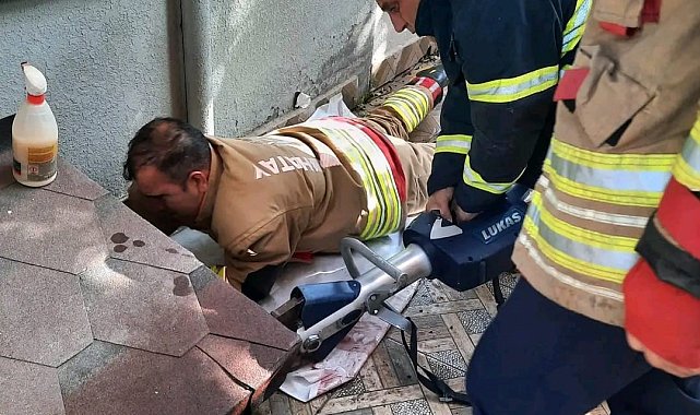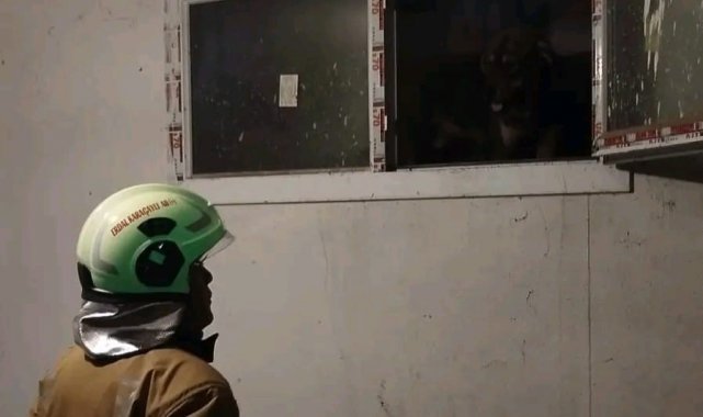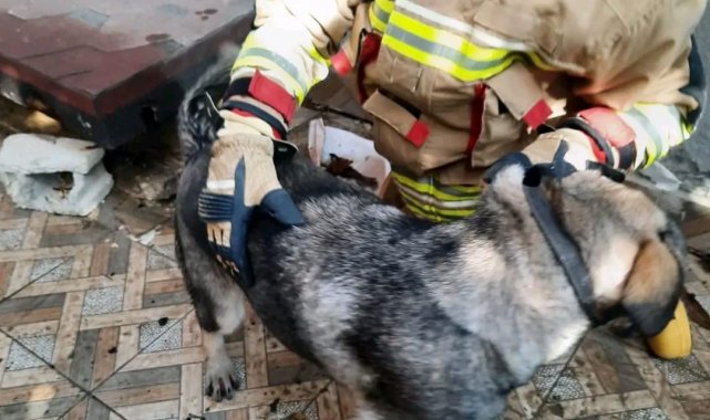 Hatay'ın Defne ilçesinde binanın havalandırma boşluğuna düşen köpek, itfaiye ekipleri tarafından kurtarıldı.