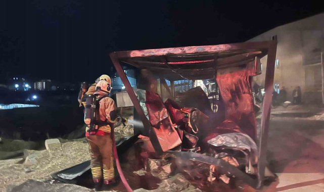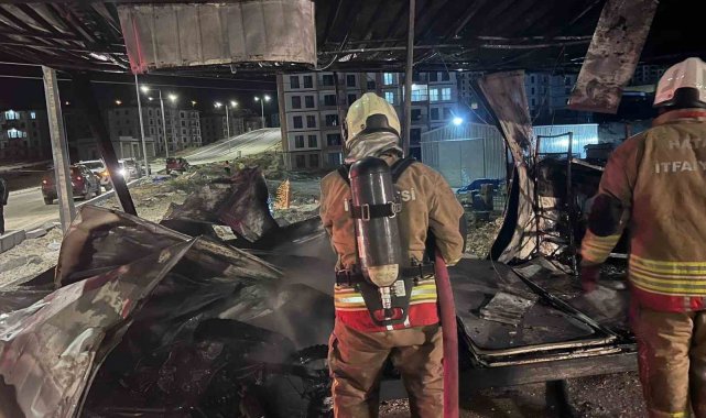 Hatay'da alevlere teslim olarak yanan şantiye alanındaki konteyner kullanılmaz hale geldi.