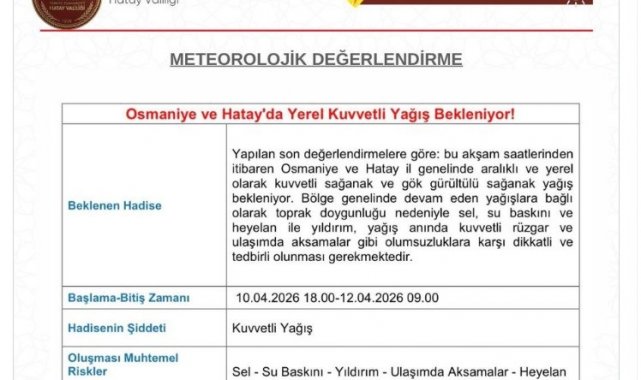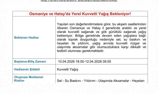 Yapılan açıklamada, "Yapılan son değerlendirmelere göre, bu akşam saatlerinden itibaren Osmaniye ve Hatay il genelinde aralıklı ve yerel olarak kuvvetli sağanak ve gök gürültülü sağanak yağış bekleniyor. Bölge genelinde devam eden yağışlara bağlı olarak toprak doygunluğu nedeniyle sel, su baskını ve heyelan ile yıldırım, yağış anında kuvvetli rüzgar ve ulaşımda aksamalar gibi olumsuzluklara karşı dikkatli ve tedbirli olunması gerekmektedir" ifadelerine yer verildi.
