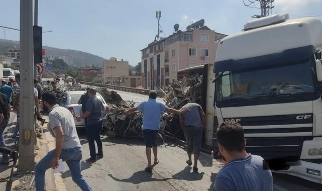 Hatay'da enkazdan çıkan demirleri taşıyan tırın devrildiği kazada, 4 araç zarar gördü.