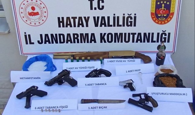Hatay İl Jandarma Komutanlığı ekipleri halkın huzurunu ve güvenliğini sağlamak amacıyla çalışmalarını aralıksız sürdürüyor. 21 Mayıs'ta Kırıkhan İlçesi Mimar Sinan Mahallesi'nde 2 şüpheli şahsa ait ev ve eklentilerinde aramalar yaptı. Yapılan aramalar sonucunda 5 adet tabanca, 250 gram metamfetamin, 150 gram kannabinoid, 5 adet tabanca fişeği, 1 adet bıçak, 1 adet yivsiz av tüfeği, 2 adet şarjör ve 2 adet motosiklet ele geçirildi. Olayla ilgili olarak 2 şüpheli şahıs gözaltına alınarak haklarında gerekli yasal işlemlere başlandı.