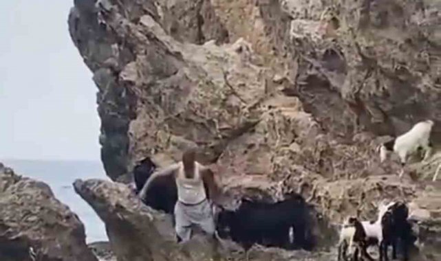 Samandağ'ın Meydan Mahallesi'nde bulunan koylarda bir çoban, keçilerini serinlemesi için denize attı
