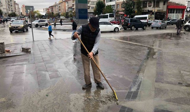 Eskişehir'de bir vatandaş, caddede yağmur sonrasında oluşan çamuru temizleyerek örnek bir davranışta bulundu.