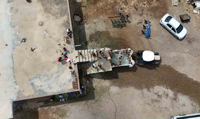 Diyarbakır'ın Çınar ilçesinde bunaltıcı sıcaklardan etkilenen çocuklar için römork içine çadır çekilip suyla dolduruldu. Evin merdivenin altına çekilip olimpik yüzme havuzu andıran sistem, dronla çekildi.