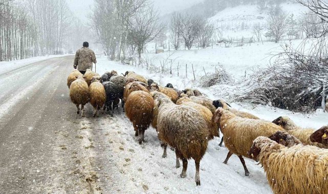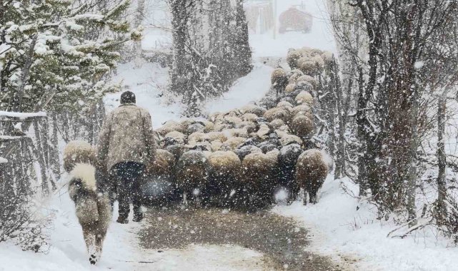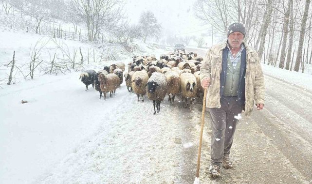 Hayvanlarını otlatmak için meraya çıkan çobanlara kar sürprizi