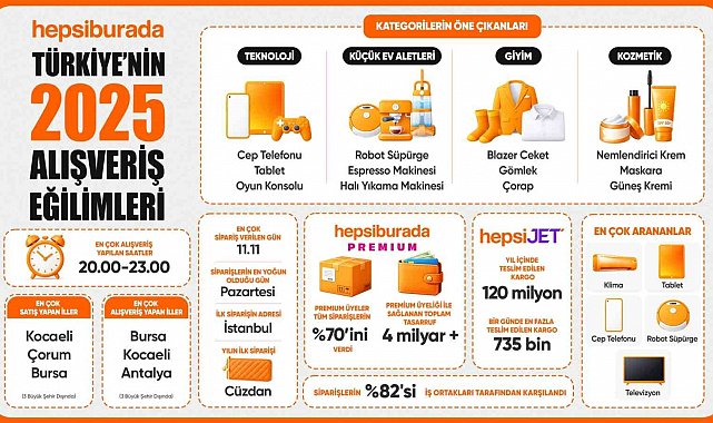 Hepsiburada, 2025 yılı boyunca platformunda verilen milyonlarca siparişi inceleyerek Türkiye'deki alışveriş alışkanlıklarına dair kapsamlı veriler paylaştı. Yıl boyunca teknoloji kategorisinde cep telefonu, tablet ve oyun konsolu en çok ilgi gören ürünler arasında yer aldı. Küçük ev aletleri kategorisinde robot süpürge, espresso makinesi ve halı yıkama makineleri öne çıktı. Giyim kategorisinde blazer ceket, gömlek ve çorap yıl boyunca tüketicilerin en çok tercih ettiği ürün grupları arasında yer aldı. Kozmetik kategorisinde ise nemlendirici krem, maskara ve güneş kremi 2025'in öne çıkan ürünleri oldu.