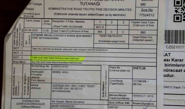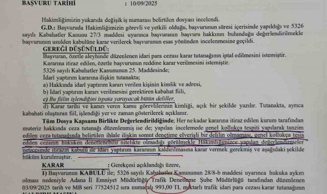 Şehirde yaşayan Memiş Akça geçtiğimiz eylül ayında 01 ETL 38 plakalı otomobiliyle merkez Seyhan ilçesine bağlı Döşeme Mahallesi'nde 'hatalı park' nedeniyle 993 TL idari para cezası yedi. Akça, avukat kızı Nazan Akça Subaşı'ya durumu anlattı. Kızı, tutanağı incelediğinde trafik cezasının trafik polisi olmayan bir polis memuru tarafından kesildiğini tespit etti. Bunun üzerine Avukat Subaşı, babasının adına Adana 6.Sulh Ceza Hakimliği'ne dava açtı. Geçtiğimiz haftalarda görülen davada mahkeme, "Genel kolluk görevlileri trafik cezası kesemez. Trafik cezası, sadece bu işin eğitimini almış trafik polisleri tarafından kesilir" diyerek 993 TL'lik cezayı iptal etti.