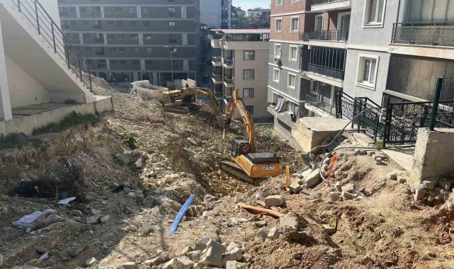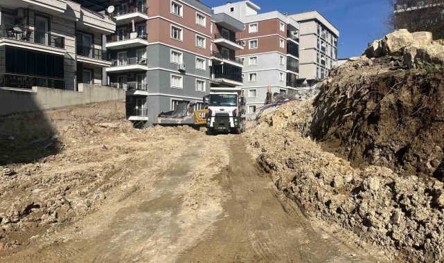 Heyelanda çöken istinat duvarının enkazını kaldırma çalışmaları sürüyor