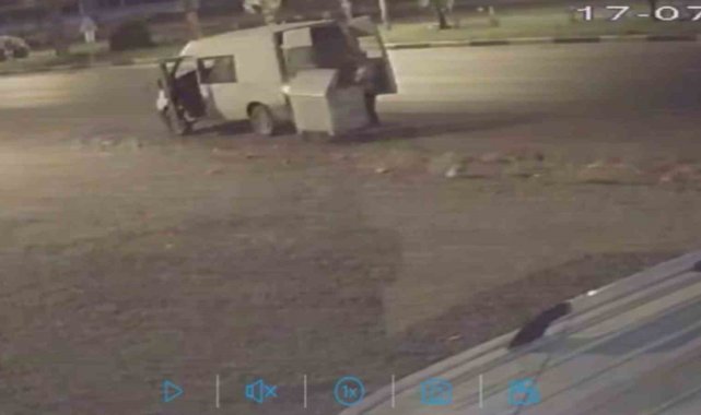 Hatay'ın Kırıkhan ilçesine araçla gelen 2 şahsın, yol kenarındaki çöp konteynerini araca yükleyip çaldıkları anlar kameraya yansıdı. Kırıkhan Belediyesi, çalınan konteynerin ardından aynı noktaya yeni çöp konteyneri yerleştirdi.