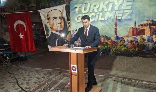 Programda bir konuşma yapan Kaymakam Muhammet Samet Bahar, "Bugün bir taraftan bir gecede 253 şehidimizin ve 2 bin 200'ü aşkın gazimizin hüznünü tekrar yaşarken, diğer taraftan da dünyada eşine az rastlanan bir direnişe şahit olmanın haklı gururunu yeniden yaşıyoruz. Hüzün ve gururun aynı anda yaşandığı bu günde tekrar ifade etmemiz gerekir ki hiçbir zafer altın tepside sunulmaz. Tarihimiz boyunca kazandığımız her zaferin arkasında bir fedakarlık vardır. Nasıl İstiklal Harbimiz ülkemizde yeni bir dönemi başlatmışsa 15 Temmuz zaferimizde Türkiye'nin önünde yeni kapılar aralamıştır. Ülkemizde ve bölgemizde yaşadığımız olaylardan çıkaracağımız dersler ışığında kendimize güvenli, güçlü ve daha aydınlık bir gelecek kurmak için daha çok çalışmak, en büyük hedefimiz olmalıdır" dedi.