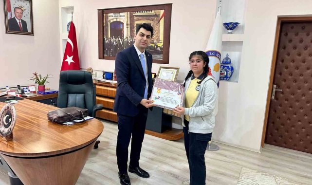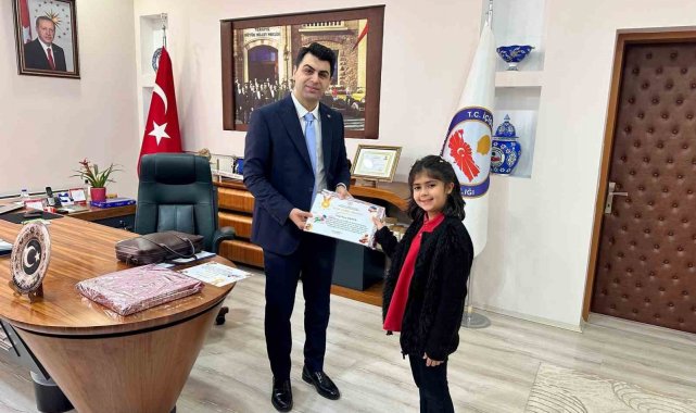 "Kütüphane Haftası" kitap okuma etkinlikleri çerçevesinde sene içinde İlçe Kütüphanesinden en çok kitap alıp okuyan Atatürk İlkokulundan Ummahan Nil Can, Cumhuriyet İlkokulundan Elif İkra Demir ve Şehitler Ortaokulundan Ayşenur Demir'i makamında kabul eden Kaymakam Muhammet Samet Bahar, öğrencilere başarı belgesi ve ödül takdim ederek başarılarının devamını diledi.