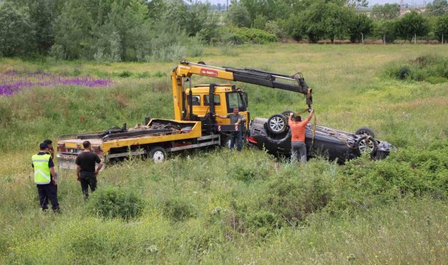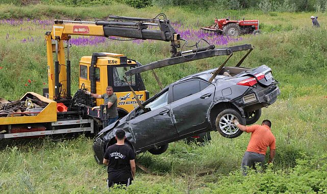 Hızla ilerleyen otomobil önündeki araca çarparak şarampole uçtu