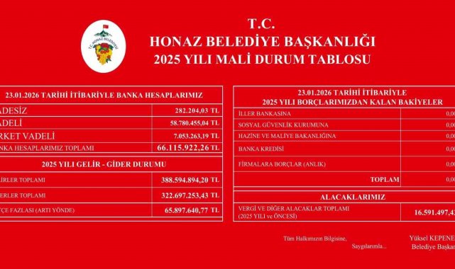 Honaz Belediye Başkanı Yüksel Kepenek'in paylaştığı bilgilere göre, Honaz Belediyesi'nin banka hesaplarının düzenli ve sağlam bir yapıda olduğu, kamu kurumları ve bankalara herhangi bir borcunun bulunmadığı açıklandı. Mali tabloya göre belediye, 2025 yılı bütçesini 65 milyon 897 bin 640 lira fazla ile kapattı.
