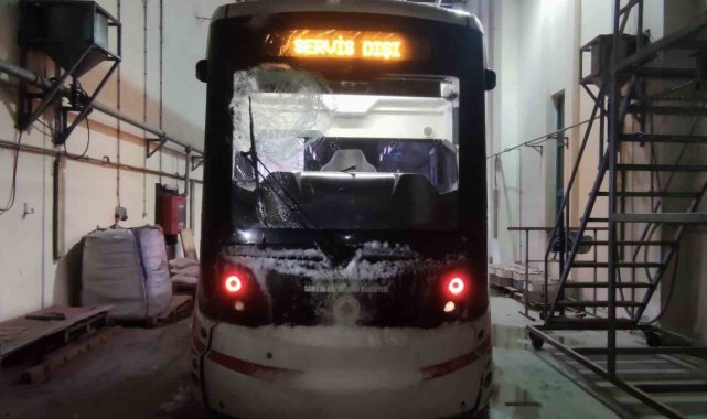 Samsun'da içine taş sıkıştırılıp atılan kartopu, tramvayın ön camını kırarak servis dışı kalmasına yol açtı.