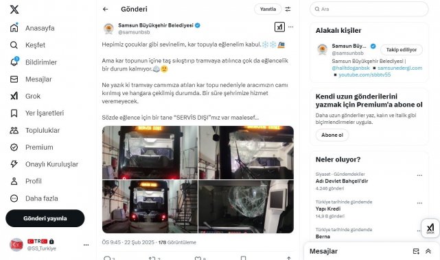 Samsun Büyükşehir Belediyesi, yaptığı sitem dolu paylaşımla olayı duyurdu. Paylaşımda, "Hepimiz çocuklar gibi sevinelim, kartopuyla eğlenelim kabul. Ama kartopunun içine taş sıkıştırıp tramvaya atılınca çok da eğlencelik bir durum kalmıyor. Ne yazık ki tramvay camımıza atılan kartopu nedeniyle aracımızın camı kırılmış ve depoya çekilmiş durumda. Bir süre şehrimize hizmet veremeyecek. Sözde eğlence için bir tane 'servis dışı'mız var maalesef" denildi.