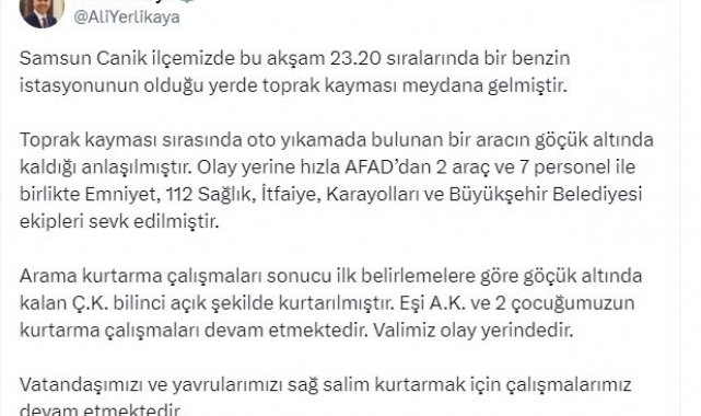 Bakan Yerlikaya, sosyal medya hesabından yaptığı açıklamada, olayın saat 23.20 sıralarında Canik ilçesinde bir akaryakıt istasyonunun bulunduğu alanda yaşandığını belirtti. Toprak kayması sırasında oto yıkama bölümünde bulunan bir aracın göçük altında kaldığını ifade eden Yerlikaya, olay yerine AFAD'dan 2 araç ve 7 personelin yanı sıra emniyet, 112 sağlık, itfaiye, karayolları ve Samsun Büyükşehir Belediyesi ekiplerinin sevk edildiğini kaydetti.