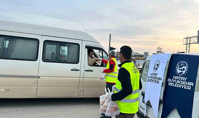Hatay Büyükşehir Belediyesi, iftara trafikte yakalanan vatandaşlar kumanya dağıtarak iftar yapmalarını sağlıyor.