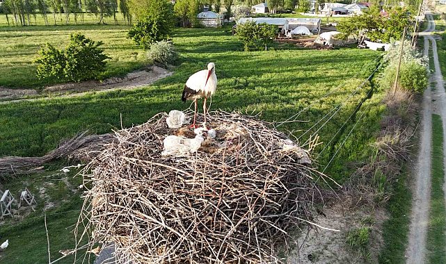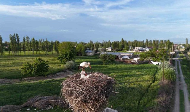Iğdır merkeze bağlı Bekirhanlı köyü, her yıl olduğu gibi bu yıl da leyleklerin uğrak noktası oldu. Köyde neredeyse her elektrik direğinin başında bir leylek yuvası bulunuyor. Yuva yapan leylekler, yumurtadan çıkan yavrularını büyük bir özveriyle büyütüyor. Dron ile havadan çekilen görüntülerde yavru leyleklerin durumu net bir şekilde gözler önüne serildi. Yavrularını her türlü tehlikeye karşı koruyan leylekler, dönüşümlü olarak yuvada nöbet tutuyor. Anne leylekler, yavrularını Aras Nehri'nden yakaladıkları balıklar ve tarlalardan topladıkları böceklerle besliyor. Leylekler, Eylül ayı geldiğinde sıcak iklimlere göç etmeden önce yavrularını yeterince besleyip büyütmek zorunda kalıyor. Bekirhanlı köyünde havadan görüntülenen yaklaşık 15 yuvadan yalnızca bir tanesinde 4 yavru bulunurken, diğer yuvalarda 3 yavru yer alıyor. 4 yavrunun bulunduğu yuvada ise yavruların bitkin düştüğü dikkat çekti. Uzmanlara göre bu durum, doğanın acımasız kurallarını da gözler önüne seriyor. Leylekler, yavrularını hayatta tutabilmek için en zayıf olanı yuvadan atarak diğerlerinin yaşam şansını artırabiliyor. Iğdır Üniversitesi Veteriner Teknikerliği 2. sınıf öğrencisi Zeki Çolak leylekler üzerine çalışma yapmak için köye geldiğini leyleklerin yaşamlarını gün boyunca izlediğini söyleyerek; "Doğu'nun Çukurova'sı olan Iğdır'ın simgesi olan leylekler genelde sonbaharda sıcak iklimlere göç ederler. Ardından ilkbaharın başlangıcında geri Iğdır'a tekrar gelirler. Mart'ın sonunda yumurtlama dönemine başlıyorlar. Leylekler iki günde bir yumurta yaparlar. Yani totalde dört yumurta yapar. Kuluçka süreleri otuz dört, otuz beş gündür. Dron ile köyde yaklaşık 15 yuva gezdik. On beş tane yuvanın sadece birinde dört yavru vardı. Diğerlerinde ise üç yavru vardı. Dört yavruların hepsi de bitkin durumda. Bunun sebebi ise leylek annenin yeterli şekilde besleme yapılmamasındadır. Yavrular genelde balık ve kurbağa gibi diğer hayvanlarla beslenirler. Bu yüzden sahip olduğumuz coğrafyada biraz daha besin eksikliği olduğundan dolayı yavrular bitkin düşmüş durumda. Anne leyleğin ise bir yavruyu heba etmesini düşünüyoruz. Çünkü diğer yavruların beslenmesi şart. Leylekler genelde elli sekiz ile altmış dört günde uçmaya başlarlar. Yani iki iki buçuk ay içerisinde uçmaya erişirler. İki yaşında ise üremeye başlarlar" dedi. Bekirhanlı köyü sakinleri ise her yıl leyleklerin gelişini memnuniyetle karşılıyor. Elektrik direkleri adeta birer leylek oteline dönüşürken, bu manzara doğa ve yaban hayatı fotoğrafçılarının da ilgisini çekiyor. Göç mevsimi öncesi yoğun mesai harcayan leylekler, doğayla uyum içinde yaşam mücadelesi veriyor.