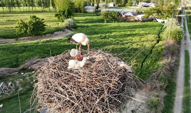 Iğdır'da elektrik direklerine yuva yapan leylekler yumurtadan çıkan yavrularını büyük bir özveriyle büyütürken anne leylek ve yavrular dron ile görüntülendi.