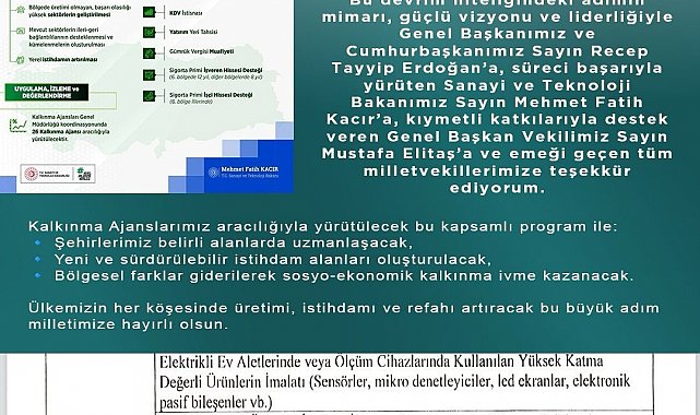 Program ile ayrıca; elektrikli ev aletlerinde veya ölçüm cihazlarında kullanılan yüksek katma değerli ürünlerin imalatı, enerji depolama sistemleri üretim tesisi ve mobilya sektöründe ileri - geri bağlantılı katma değeri yüksek ürünlerin üretiminin de Kayseri'de yapılacağı bildiridi.