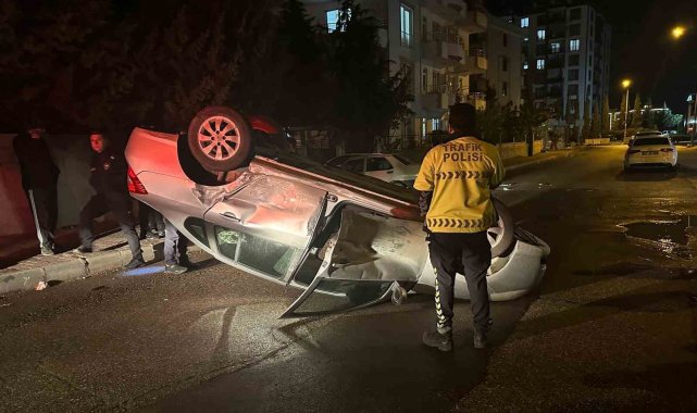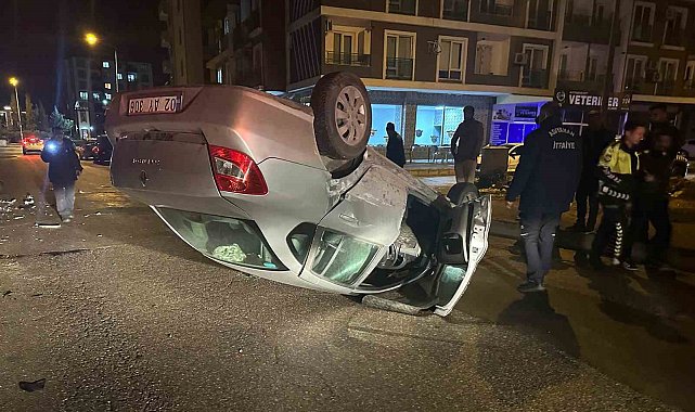 İki otomobilin çarpışması sonucu araçlardan biri ters döndü
