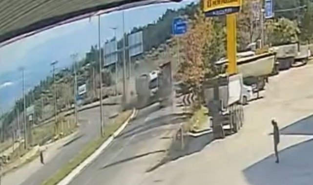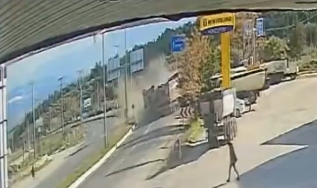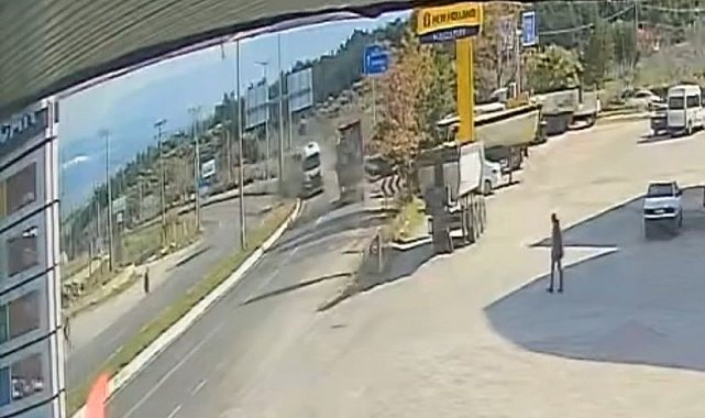 Meydana gelen feci kazanın görüntüleri ortaya çıktı. Karayolu üzerinde faaliyet gösteren bir akaryakıt istasyonunun güvenlik kamerasına yansıyan görüntülerde tırın kontrolden çıkarak, karşı şeride geçip karşı yönde gelen tıra çarptığı anlar yer aldı.