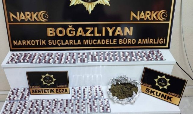 Emniyet ekipleri, Boğazlıyan ilçesinde uyuşturucu madde ticareti yaptığı öne sürülen 2 şüpheliyi gözaltına aldı. Şüphelilerin araç ve üst aramasında 831 sentetik ecza hapı ve 186 gram skunk maddesi ele geçirildi. Gözaltına alınan şüpheliler emniyetteki işlemlerinin ardından sevk edildiği adliyede çıkarıldığı hakimlikçe tutuklandı.