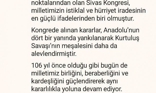 Cumhurbaşkanlığı İletişim Başkanı Burhanettin Duran, "Milli Mücadele'nin ve Cumhuriyet'in kurulmasında tarihi dönüm noktalarından olan Sivas Kongresi, milletimizin istiklal ve hürriyet iradesinin en güçlü ifadelerinden biri olmuştur.106 yıl önce olduğu gibi bugün de milletimiz birliğini, beraberliğini ve kardeşliğini güçlendirerek aynı kararlılıkla yoluna devam ediyor" dedi.