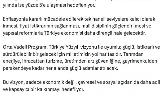 Cumhurbaşkanlığı İletişim Başkanı Burhanettin Duran, "Orta Vadeli Program, Türkiye Yüzyılı vizyonu ile uyumlu; güçlü, istikrarlı ve sürdürülebilir bir gelecek için milletimizin yol haritasıdır. Tarımdan enerjiye, ihracattan turizme, üretimden arz güvenliğine, gayrimenkulden perakendeye kadar her alanda güçlü adımlar atılacak" dedi.