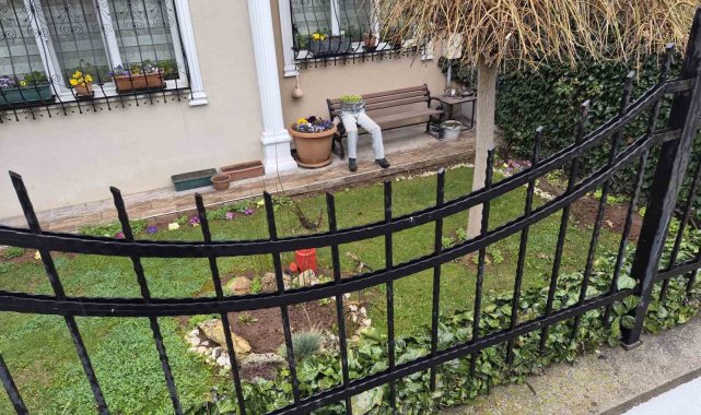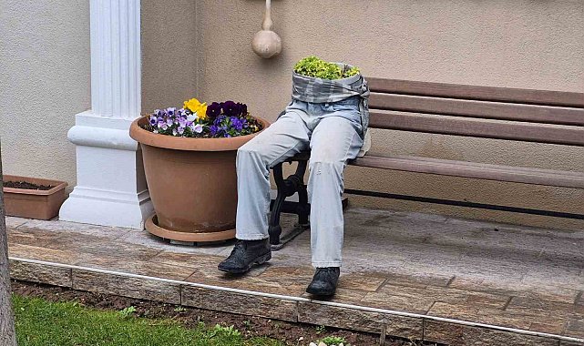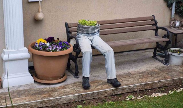 Ertuğrulgazi Mahallesi Şanver Sokak'ta bulunan bir evin bahçesindeki bankın üzerine yerleştirilen dekorasyon göze çarptı. Ayakkabı, pantolon ve saksı birleştirilerek yapılan dekorasyon, sanki bankın üzerinde oturan birisi varmış gibi görüntü oluşturdu. İnsan figürlü saksı, hem ilginç, hem de ürkünç yönüyle çevreden geçenlerin dikkatini topladı.