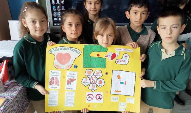 Düzce Karaçalı Süperlik İlkokulu öğrencileri hazırladıkları afiş ile sigara ve alkolün zararlarını anlattı.