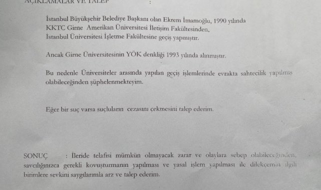 Özcan, İHA muhabirine yaptığı açıklamada, seçimler öncesi bir gazetede gördüğü haber sonrası İmamoğlu hakkında araştırma yapmaya başladığını dile getirerek, "Sonrasında araştırmaya başladım, Kıbrıs Girne Amerikan Üniversitesi yazıyordu, zaten Kıbrıs olunca şüphelendim. Daha sonra YÖK denkliğinin olmadığını fark ettim. İmamoğlu Kıbrıs Girne Amerikan Üniversitesi'nden 1990 yılında geçiş yapıyor ancak bu üniversitenin YÖK denkliği 1993 yılında veriliyor. Ben bunu gördüm, usulsüzlük olduğu çok belliydi. Sonrasında suç duyurusunda bulundum. Kendisi de Girne Amerikan Üniversitesi'nde okumasına rağmen Doğu Akdeniz Üniversitesi olarak geçiş yapmış. Suç duyurusundan sonra soruşturma açıldı, kamu davasına döndü ve verdiğim hukuki mücadeleyi kazandım" dedi.