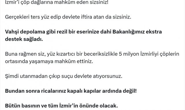İzmir'de CHP'li belediyelerin çözüm üretemediği çöp kriziyle ilgili sorumluluğu Çevre ve Şehircilik Bakanlığına yüklemeye çalışan CHP Genel Başkan Yardımcısı Gökan Zeybek'e, AK Parti Genel Sekreteri Eyüp Kadir İnan'dan sert tepki geldi. İnan, "İzmir'i çöp dağlarına mahkum eden sizsiniz. Gerçekleri ters yüz edip devlete iftira atan da sizsiniz. Bundan sonra ricalarınız kapalı kapılar ardında değil, bütün basının ve tüm İzmir'in önünde